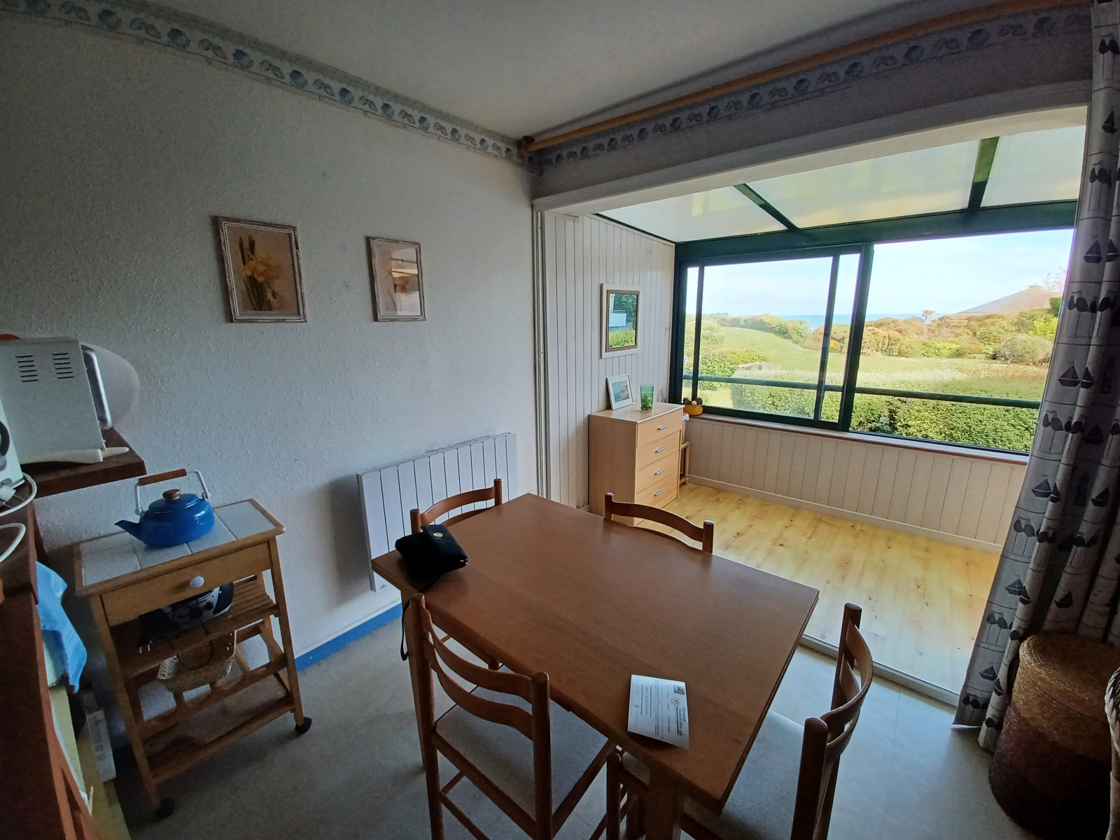 Exclusivité CARANTEC, vente appartement vue mer de type studio cabine, la plage à 100 m comprenant entrée, chambre cabine, coin cuisine ouvert sur pièce de vie et balcon-terrasse vitré et clos face à la mer. Place de stationnement privative. Bien rare comme pied à terre ou investissement locatif.