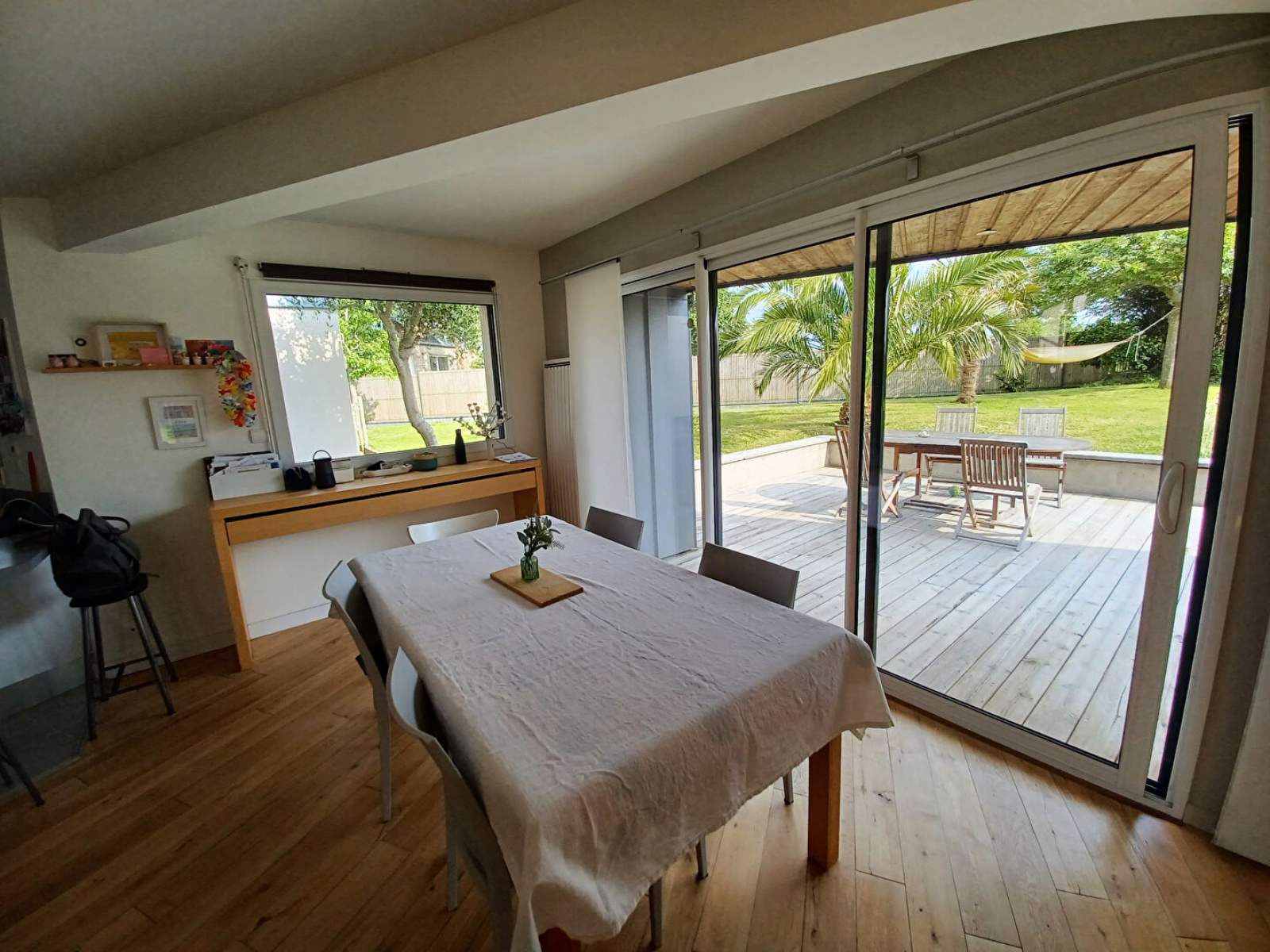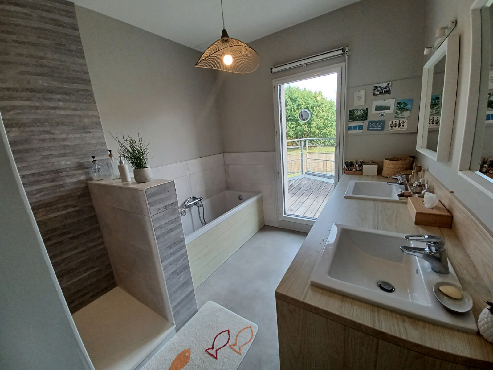 Bretagne, baie de Morlaix, Carantec ses plages , son golf, sa douceur de vivre ; vente maison de 2005 avec extension de 2011, comprenant entrée, séjour - cuisine aménagée et équipée donnant sur la terrasse bois et le jardin exposés Sud, salon détente avec cheminée insert double face ; habitable de plain pied avec chambre et salle d'eau privative, wc, cellier, garage attenant. A l'étage, une mezzanine desservant 4 chambres dont une avec dressing, salle de bain et douche, balcon - terrasse. A découvrir.