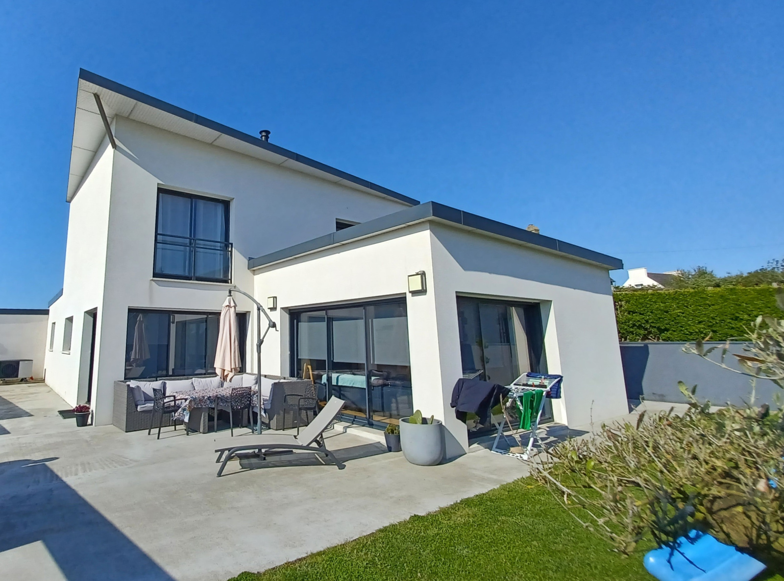 En vente secteur bord de mer en Bretagne, Finistère Nord, tout proche de Cléder et située au calme sur un terrain de 980m2 entièrement clos, cette maison de 2021 habitable de plain-pied dispose d'une belle pièce de vie avec cuisine aménagée et équipée, grand salon séjour très lumineux avec poêle à bois, cellier, chaufferie, chambre parentale avec dressing et salle d'eau privative. A l'étage: 3 chambres avec rangements, salle de bains et toilettes. Garage de 41m2 et grande terrasse exposée sud ouest. Très belles prestations, à découvrir! RARE.