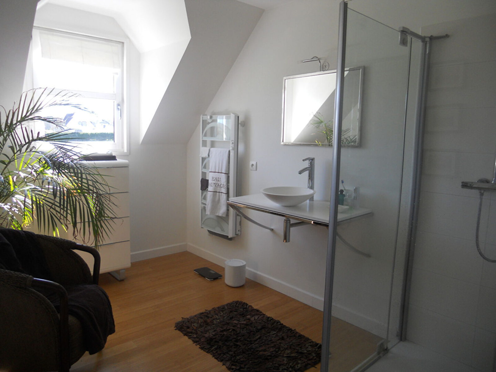 Maison à vendre Bretagne, Locquénolé, proche du bord de mer en Baie de Morlaix et des plages de Carantec, vente très belle maison à ossature bois de 2009, très lumineuse offrant de vastes espaces à vivres, salon, séjour, cuisine aménagée et équipée, le tout donnant sur une terrasse semi-couverte et un grand jardin paysagé exposé Sud. A l'étage, 4 grandes chambres dont une de 35 m², salles d'eau privatives. Double garage. Très belles prestations.